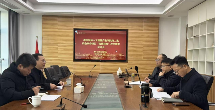 2025年12月18日上午,现代农林人工智能产业乐鱼网页版登录入口举行第二批校企联合项目“揭榜挂帅”攻关需求研讨会。杭州感知科技有限公司总经理杨来邦,副总经理王永众,数计乐鱼网页版登录入口兼现代农林人工智能产业乐鱼网页版登录入口院长冯海林,数计乐鱼网页版登录入口党委书记何振波、副院长胡军国参会。