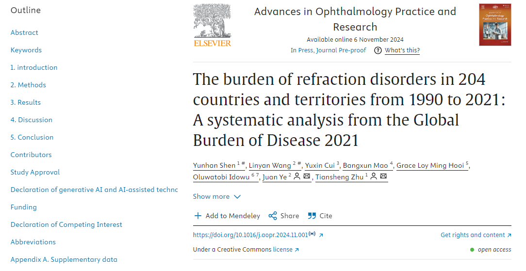 近日,我校数学与计算机科学乐鱼网页版登录入口计算机科学与技术专业2021级本科生沈韫涵以第一作者在国际期刊眼科实践与研究新进展《Advances in Ophthalmology Practice and Research》 (AOPR)上发表题为“The burden of refraction disorders in 204 countries and territories from 1990 to 2021: A systematic analysis from the Global Burden of Disease 2021”的学术研究论文。