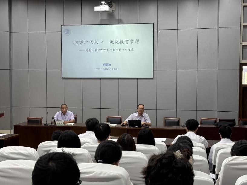 何振波首先祝贺各位数计学子顺利完成学业,迈入就业入职、升学深造的人生新阶段。在《把握时代风口,筑就数智梦想》的党课中,他强调,各位毕业生党员要牢记党员身份,搞好学习教育,履职尽责;遵守党的纪律,做到干净担当,守牢底线;做好关系转接,积极融入组织,发挥作用。他结合毕业就业、文明离校、满意度调查、校友工作等与大家进行了交流叮嘱,希望大家在事业发展上做一个长期主义者,在为人处世上做一个靠谱的人,共同打造好校友与母校的文化共同体、命运共同体。