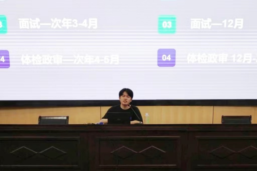 2024届毕业生代表官洪林、朱润昊分享了考研备考过程中的时间规划、复习资料建议、心态调整及面试准备经验,为在座的学生提供了宝贵的第一手资料。李科艺就考公中选岗、备考和面试提出了建议,鼓励同学们在备考中要调整好心态,积极备考。此外,会议还邀请了跨洋留学通的何亚成老师为同学们带来出境留学规划分享,拓宽了大家的升学思路。