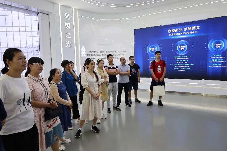老师们在工作人员的带领下,首先参观了超算中心的展示区。观看了展厅里陈列的一代代芯片实物,了解了超算中心如何以芯片为核心,围绕“芯—端—云—算”构建完整自主的产业链与工业链的发展历程。随后,岗员们参观了“乌镇之光”的算力中心——硅立方,硅立方内服务器林立,采用全球领先的“浸没相变液冷技术”,并自研核心技术,芯片全部国产化,实现计算领域核心技术自主可控,其超强的计算能力,达到国际一流水平。最后,老师们还走进年产20万台高端服务器的中科曙光服务器生产基地,了解了服务器的生产组装流程。