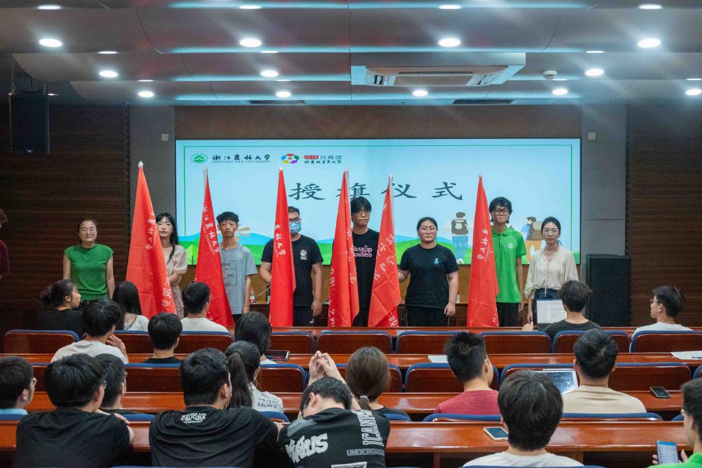 致辞结束后,黄萍和袁晓燕共同为实践代表团队授旗。