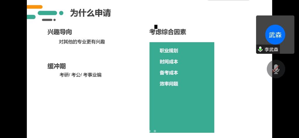 李武森学长从为何报考、报考流程、常见问题等几个方面为同学们进行了真诚的分享,剖析了他在这个过程中的收获与感悟。对同学们提出的问题,李武森学长给与了耐心认真的解答,提醒同学们结合自身情况,理性做出选择,并尽快做好申报准备。