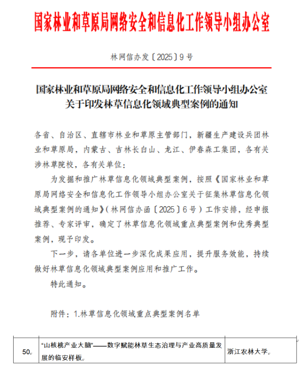 近日,我校“山核桃产业大脑”——数字赋能林草生态治理与产业高质量发展的临安样板项目凭借创新性技术应用和显著成效,成功入选国家林业和草原局林草信息化领域重点典型案例,成为全校唯一获此殊荣的项目。