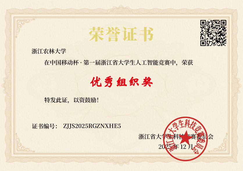 近日,浙江省大学生科技竞赛委员会主办的“中国移动杯·第一届浙江省大学生人工智能竞赛”获奖名单揭晓。我校参赛队伍团结拼搏,表现突出,荣获一等奖3项,二等奖3项,三等奖7项,同时获评“优秀组织奖”。